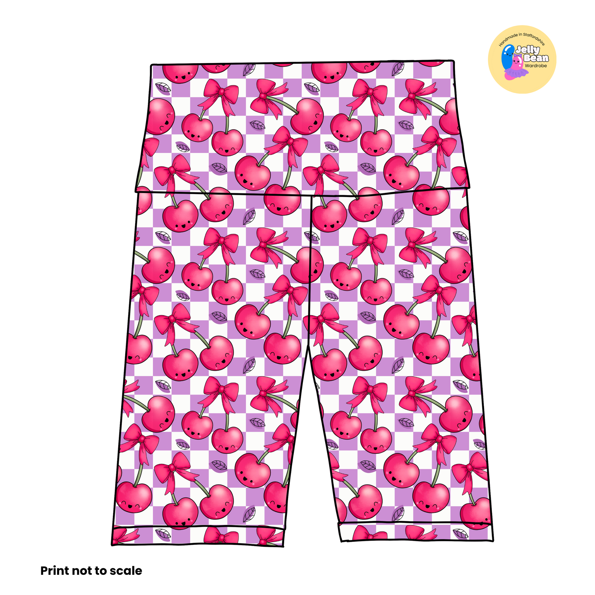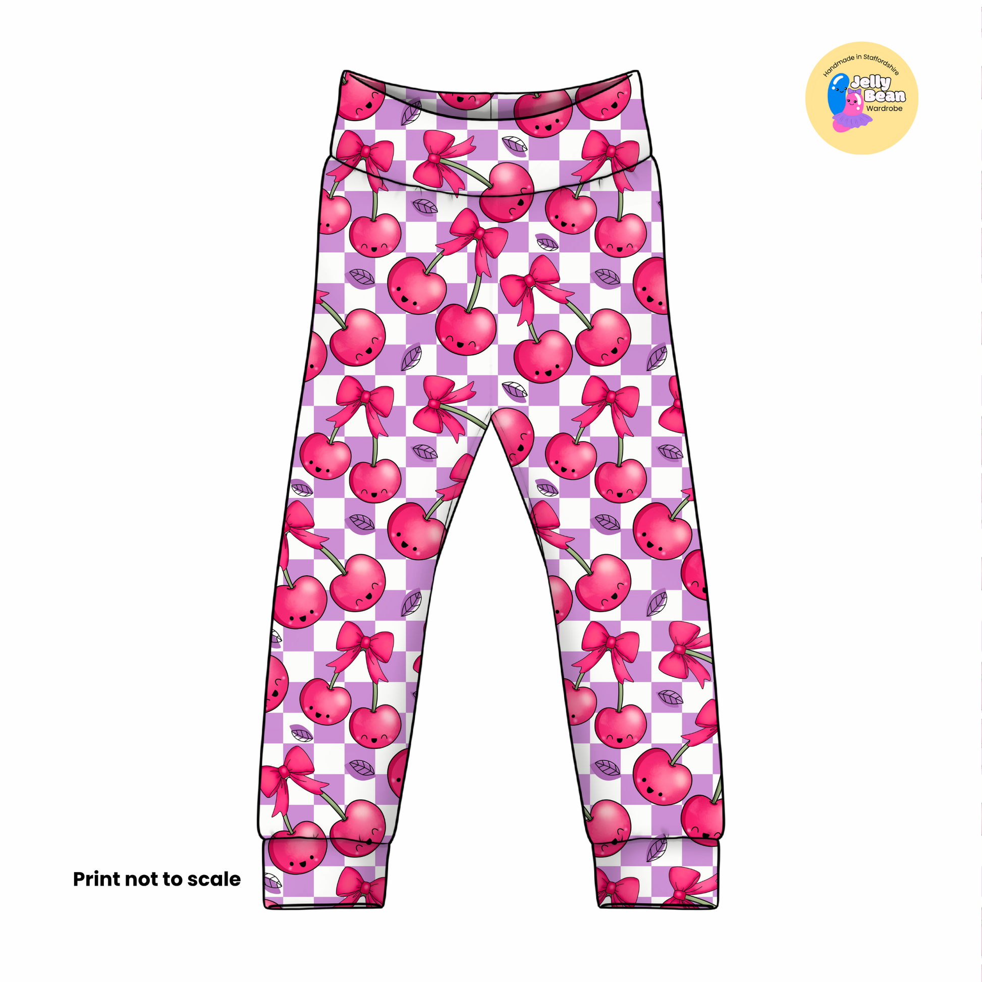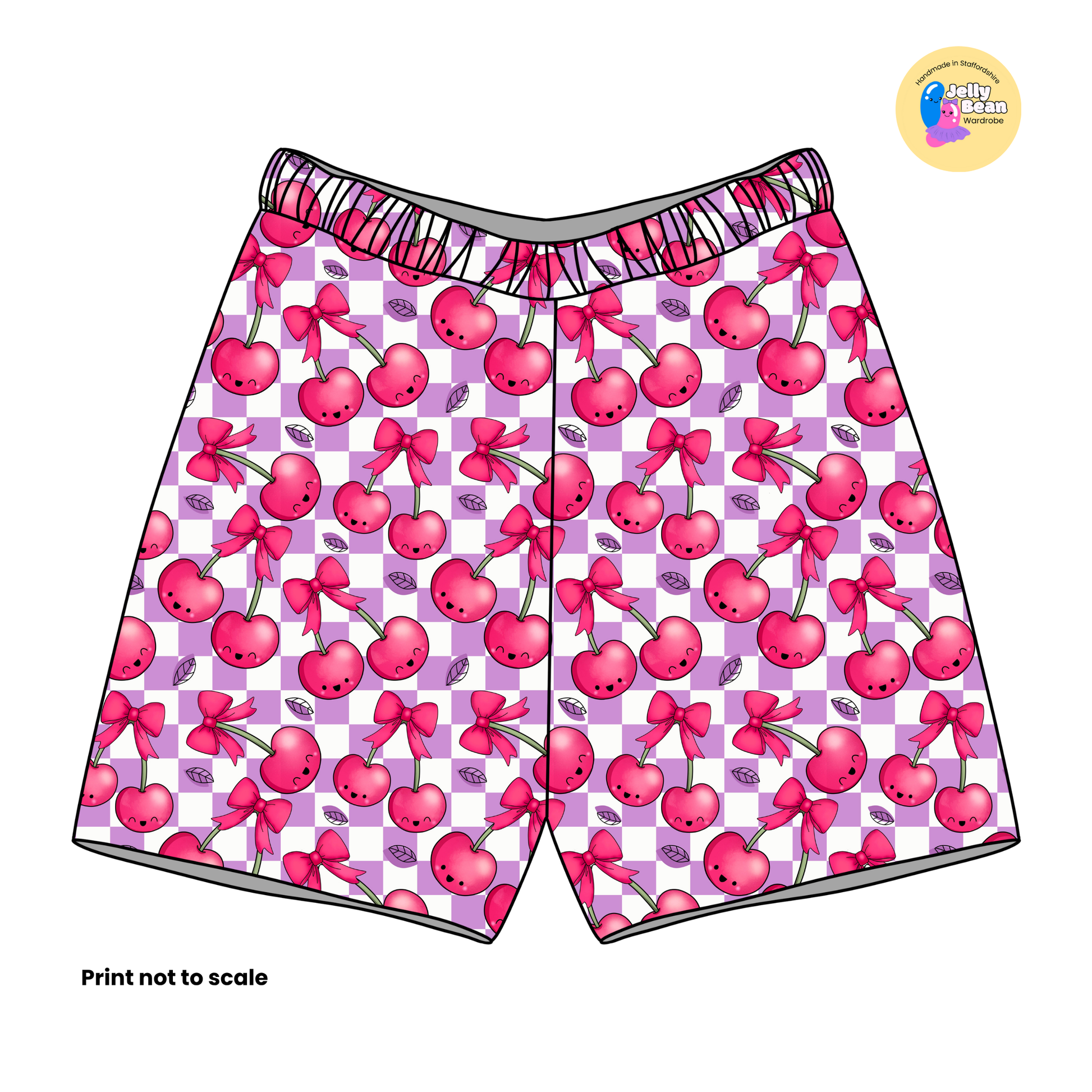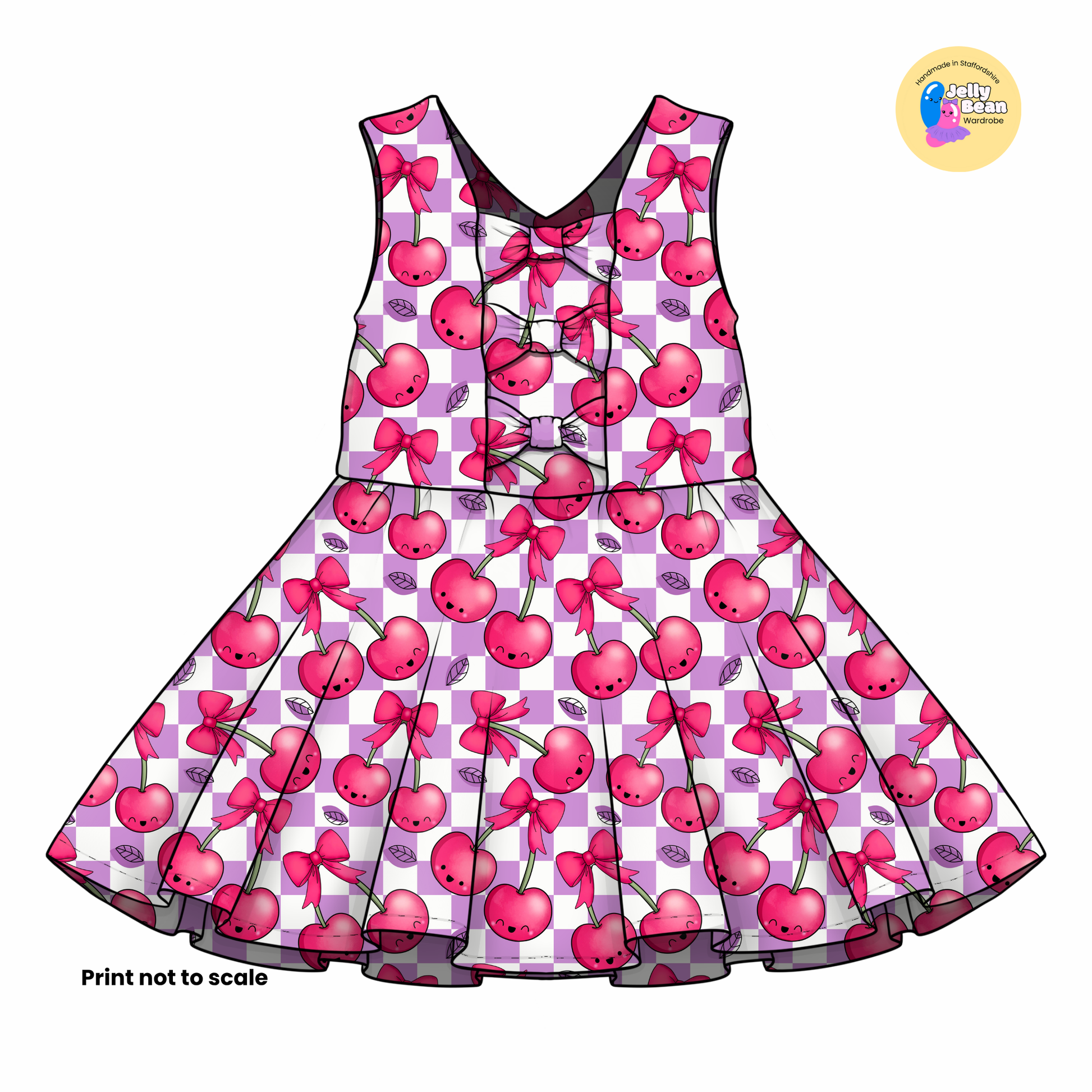 A sweet and playful print featuring cherries, bows and soft checkerboard details, available to be made into your chosen Jelly Bean Wardrobe pieces.