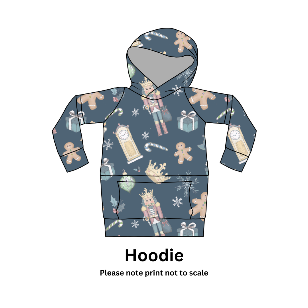 Festive and full of story – Nutcracker Magic brings the enchantment of Christmas to life. This soft French Terry features hand-illustrated nutcracker soldiers, gingerbread men, gifts, candy canes, crowns, clocks, ornaments, holly, and snowflakes dancing across a deep winter blue background. Perfect for cozy celebrations and magical everyday wear.